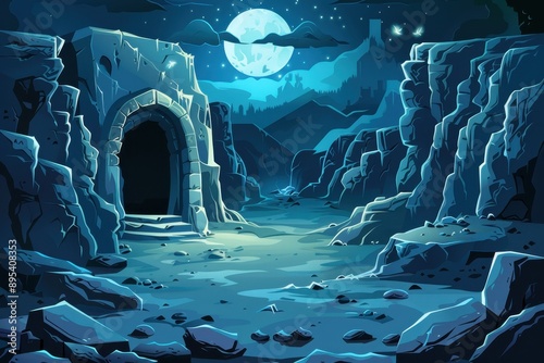 Fototapeta premium Mystical moonlight illuminates the entrance to a forgotten temple in a mystical mountain landscape