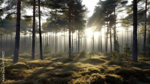 Obraz premium Mystical morning light in a forest at dawn with fog, generative ai