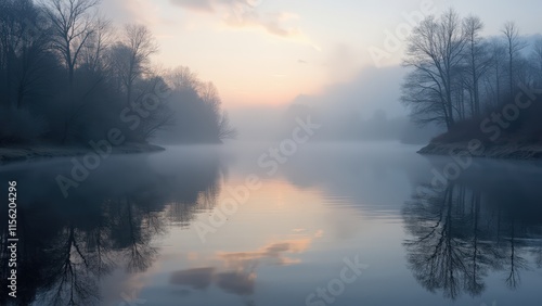 Fototapeta premium Mystical Morning Mist: Serene River Landscape at Dawn