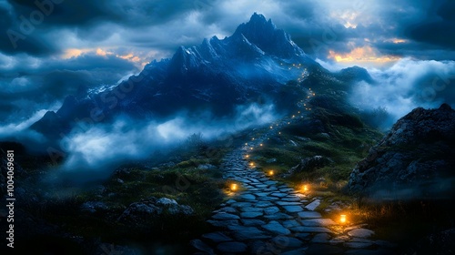 Naklejka premium Mystical Mountain Path with Fog and Lanterns at Twilight