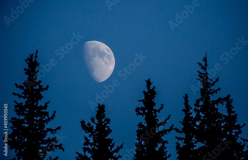 © Vera, Naklejka premium mystical night moon background stars against a background of coniferous forest