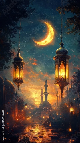 © Umi Sakina, Fototapeta premium Mystical night scene with lanterns and mosque