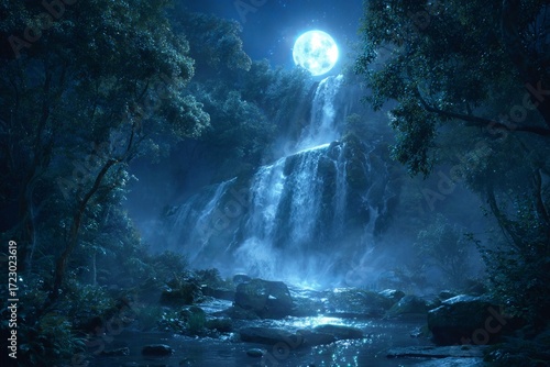 © inas, Obraz premium Mystical night waterfall landscape