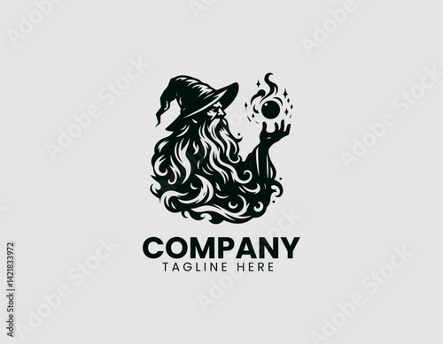 Fototapeta premium Mystical Old Witch Silhouette Long Beard Spell Stars Vector Logo Design