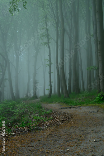 Naklejka premium Mystical paths in the foggy forest on the island of Ruegen, Germany
