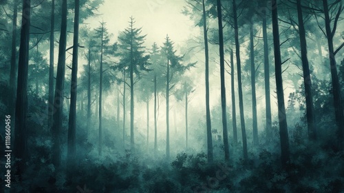 © YauheniB, Naklejka premium Mystical pine forest in ethereal mist