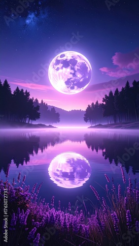 Fototapeta premium Mystical Purple Full Moon Over a Serene Lavender Lake