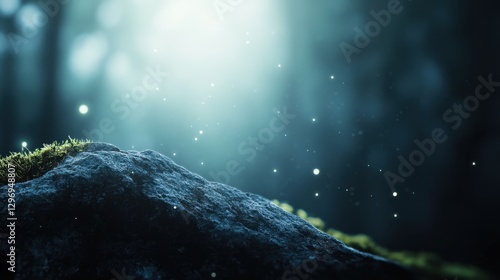 © zetrum, Obraz premium Mystical scene with a mossy rock and floating lights in a dreamlike forest setting, serene vibe