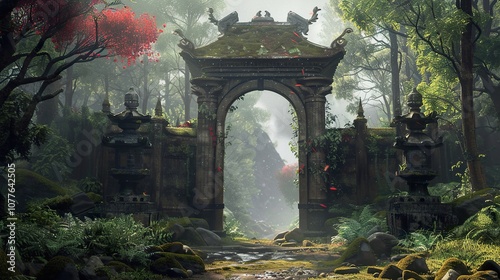 © Infinity, Obraz premium Mystical Stone Archway Leading Through a Lush Forest