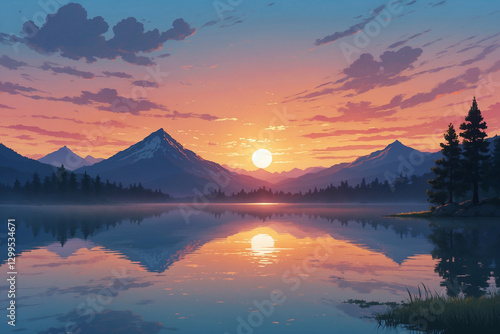 © faisal, Obraz premium Mystical sunset at a tranquil lake with mountain reflections and soft mist in anime style
