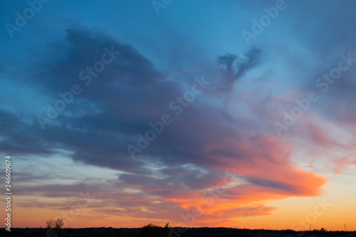 Naklejka premium Mystical sunset clouds over the countryside in blue and orange tones
