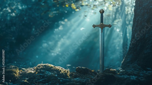 Naklejka premium Mystical sword in sunlit forest.