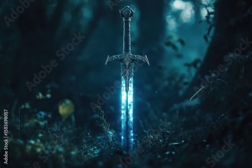 Naklejka premium Mystical sword with glowing blade resting in a dark forest during twilight hours