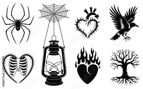 © ibrahim, Naklejka premium Mystical Symbol Icon Set – Gothic Silhouettes of Nature, Anatomy, and Emotion