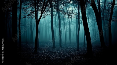 Naklejka premium Mystical Teal Foggy Forest Atmospheric Dark Fantasy Landscape with Mysterious Trees and Hazy Depths, Moody and Ominous Vibe