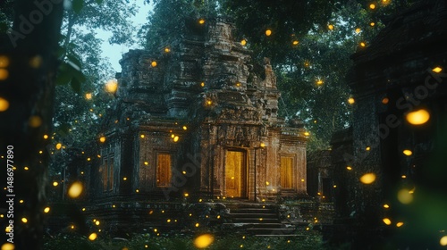 © Barokahe, Naklejka premium Mystical temple illuminated by ethereal fireflies, set in a dense jungle