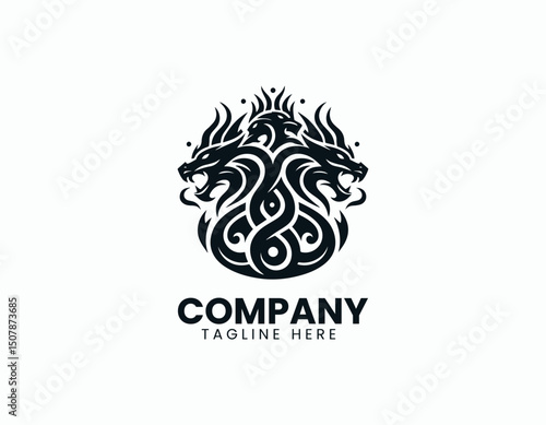 © Dawi Firdaus, Fototapeta premium Mystical Three-Headed Dragon Emblem Illustration Vector Logo Design