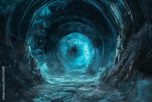 Obraz premium Mystical tunnel with a bright blue portal at the end