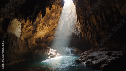 Fototapeta premium Mystical Underground Cave with Waterfall
