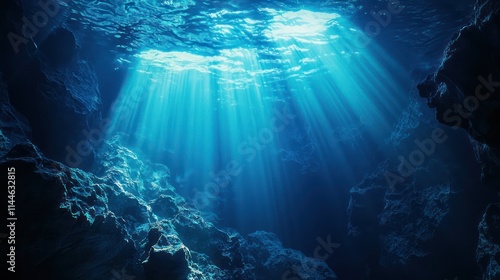 Fototapeta premium Mystical Underwater Abyss with Deep Blue Waters Illuminated by Sunlight