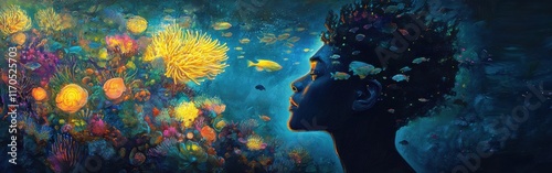 Naklejka premium Mystical underwater profile of a man surrounded by vibrant marine life and corals in an enchanting ocean setting