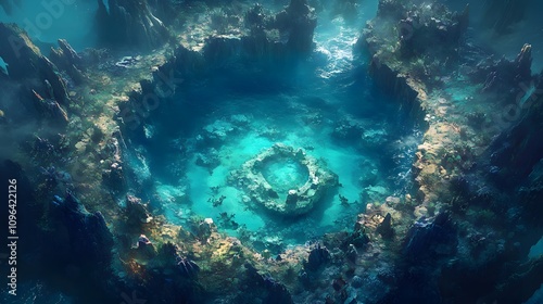 © QITIAN, Fototapeta premium Mystical underwater ruins glow in turquoise waters, showcasing nature's art.