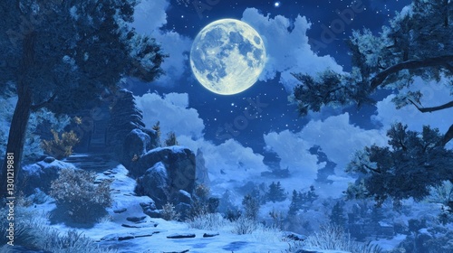 Naklejka premium Mystical Winter Landscape with Full Moon Shining Brightly in Night Sky
