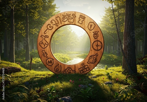 Obraz premium Mystical wooden circle with ancient symbols rests in a sun-drenched forest...