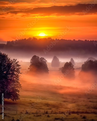 Fototapeta premium Mystische Landschaft im Nebel bei Sonnenaufgang, Generative AI