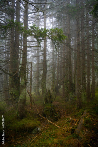 Fototapeta premium Mystischer Bergfichtenwald bei Nebel im Riesengebirge 11