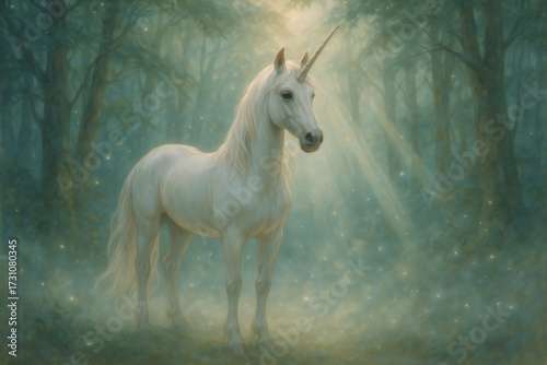 © Bijac, Obraz premium Mythic unicorn amid luminous misted forest with ethereal light and floating motes