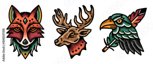 © Putra, Naklejka premium Mythical Creatures Trio in Bold Line Illustration Featuring Fox, Deer, and Bird