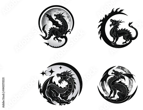 © Illustra, Fototapeta premium Mythical Dragon Silhouette with Crescent Moon – Fantasy Tattoo or Logo Vector Design
