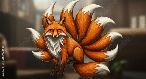 © Ariestia, Naklejka premium Mythical orange fox creature with multiple elaborate tails stands facing forward