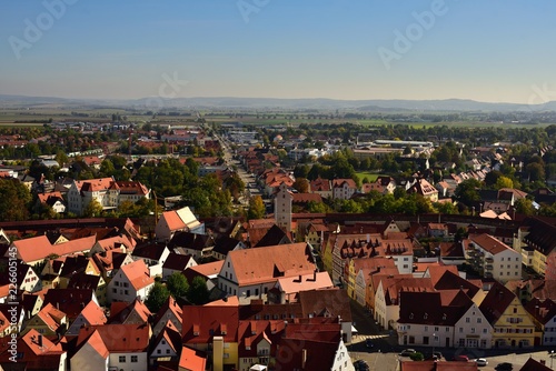 Obraz premium Nördlingen, mittelalterliche Stadt, Bayern, Deutschland, Europa, anreisen, Fremdenverkehr, alt, historisch, Geschichte, panorama, Rieskrater, Kraterrand am Horizont, architektur, bauwerk, stadtmauer,