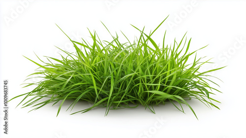 © Sawyer0, Fototapeta premium Na białym tle widać gęstą, soczystą zieleń wiosennej trawy, która zdaje się być pokryta kroplami rosy.