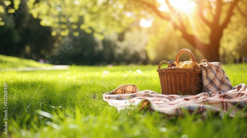 Obraz premium Na trawie leży kolorowy piknikowy koc obok kosza piknikowego. Słoneczna pogoda sprzyja piknikowaniu na świeżym powietrzu w parku
