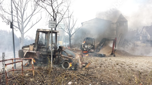 © pb press, Fototapeta premium Nach einer Gasexplosion zerstörte Baumaschinen