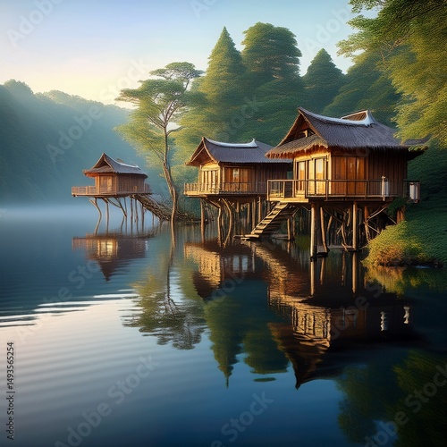 Fototapeta premium Nachhaltige Baumhäuser direkt am Seeufer in waldreicher Umgebung