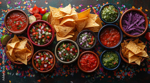 Fototapeta premium Nachos, salsa and salads on a black background top view, created with...