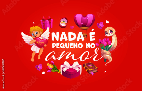 © Buch&Bee, Fototapeta premium Nada e pequeno no amor Valentines day Spanish quote. Cartoon Valentines banner with angel, heart balloon, flowers, snake and gift box. Vector romantic characters on red background with love elements