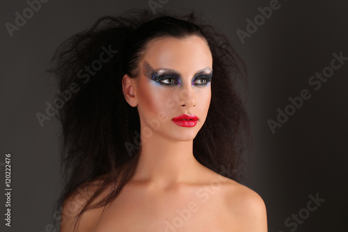 Fototapeta premium Naga kobieta z makijażem i dzikimi włosami. Ścieśniać. Szare tło