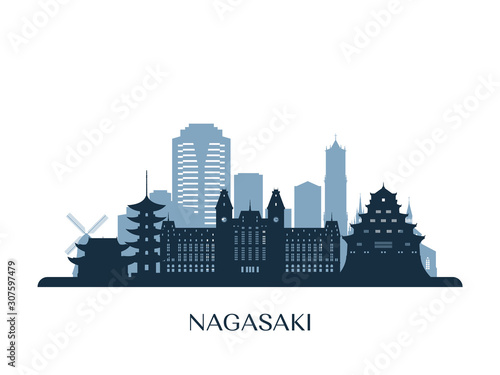 © greens87, Naklejka premium Nagasaki skyline, monochrome silhouette. Vector illustration.