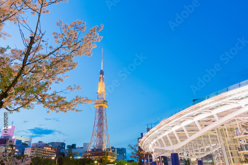 © nonchanon, Fototapeta premium Nagoya tv tower in night with beautiful cherry blossom.