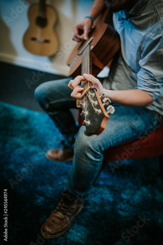 © Sonja, Obraz premium Nahaufnahme der Hände, Finger eines Gitarristen der Gitarre spielt