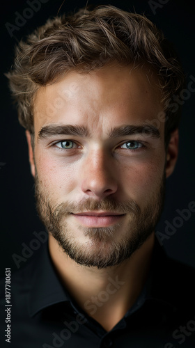 © www.freund-foto.de, Obraz premium Nahaufnahme eines attraktiven Mannes mit Dreitagebart vor dunklem Hintergrund