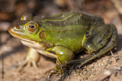 Fototapeta premium Nahaufnahme von einem Wasserfrosch / Teichfrosch in der Sonne in einem Naturschutzgebiet in Wehrheim, Hochtaunuskreis