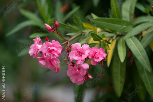 Obraz premium Nahaufnahme von rosa Oleanderblüten im Garten