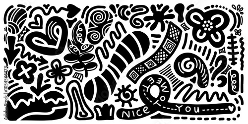 Fototapeta premium Naive cute abstract shapes sticker pack. Fun funky flowers, bubbles, stars, circles, eyes typography in trendy retro 90s cartoon style