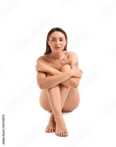 Fototapeta premium Naked beautiful young woman sitting on white background